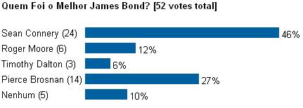 Esta sondagem foi feita no blog português sobre cinema, "Cine7", onde os visitantes desse blog votaram nos inquéritos realizados nesse mesmo site. Este gráfico não é da nossa autoria e foi retirado do blog "Cine7", com o intuito de perceber o que pensa a amostra estudada sobre uma das personagens mais famosas do mundo da 7ªarte, a personagem de acção James Bond. Essa personagem tem a particularidade de já ter sido interpretada por vários actores e é esse facto que é analisado na sondagem seguinte: