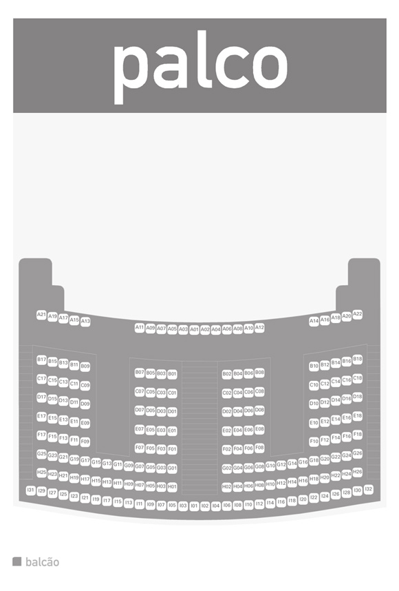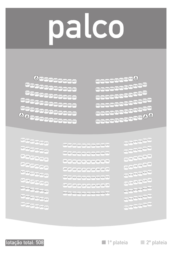 A Sala de exibições de filmes do cine-teatro tem uma capacidade de 508 pessoas. Aqui fica a planta da plateia da sala e do Balcão (patamar superior à plateia).