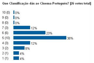Esta sondagem foi feita no blog português sobre cinema, "Cine7", onde os visitantes desse blog votaram nos inquéritos realizados. Este gráfico não é da nossa autoria e foi retirado do blog "Cine7", com o intuito de perceber o que pensa o público português do cinema Português. A classificação foi estipulada como o mínimo sendo o 1 e o máximo sendo o 10.